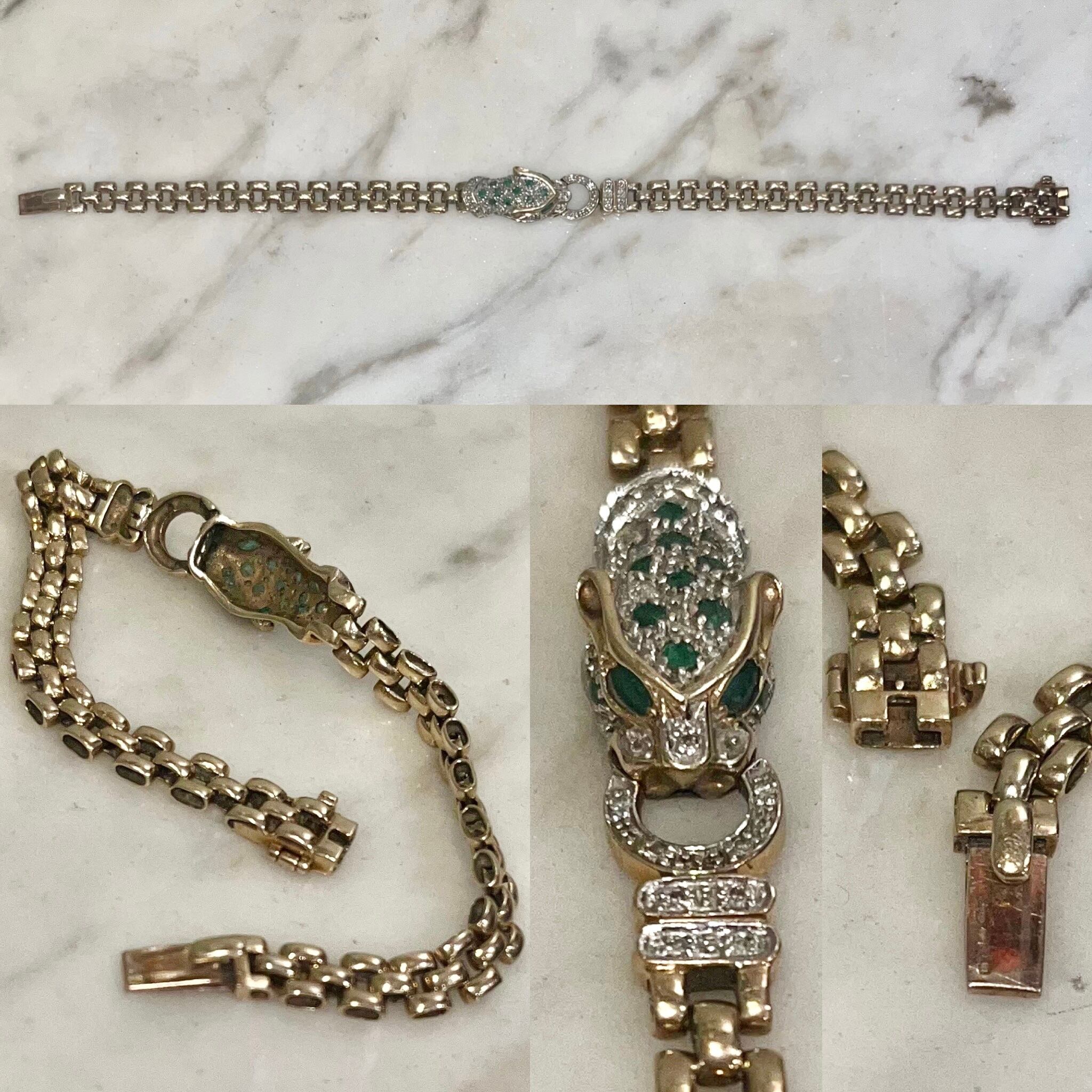 vintage 9ct gold panther head panther chain bracelet set with emelard&diamond