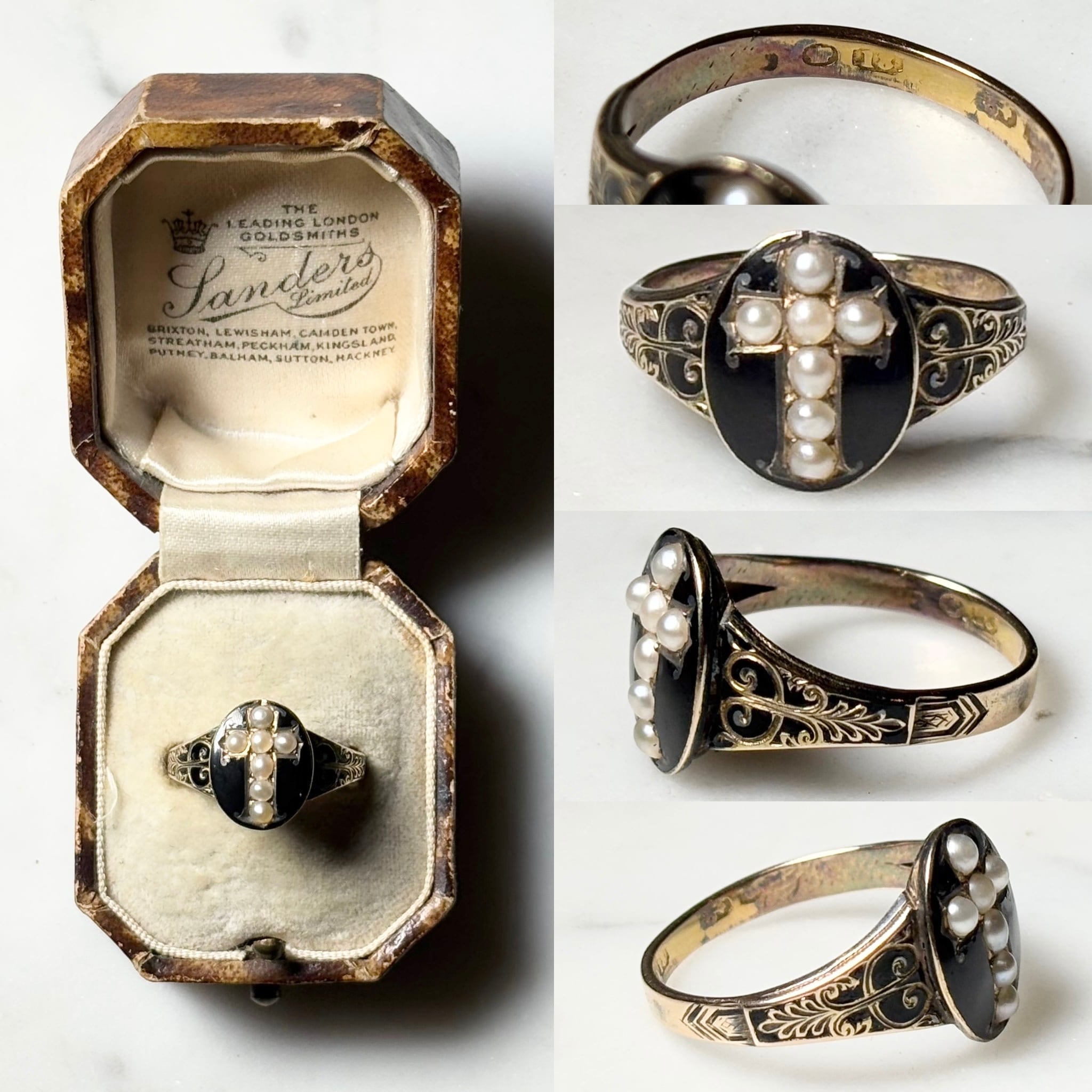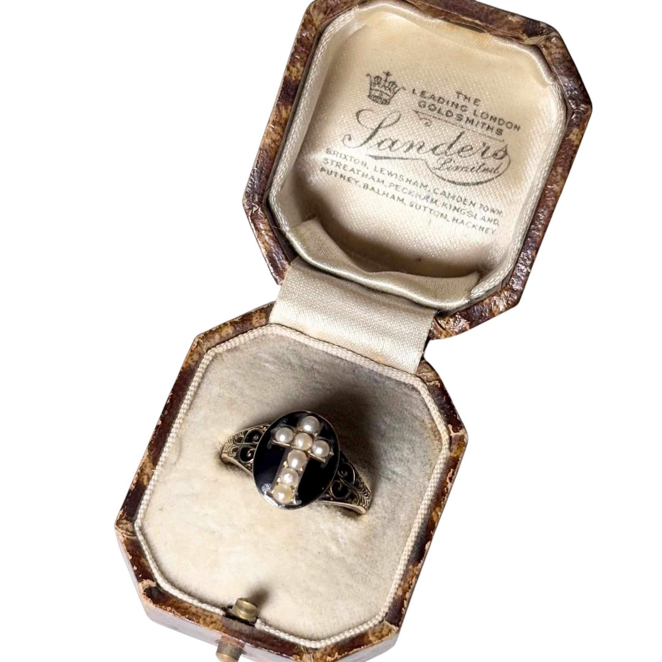 ブラックエナメルの台座に十字架配置でシードパールを7点嵌め込み。