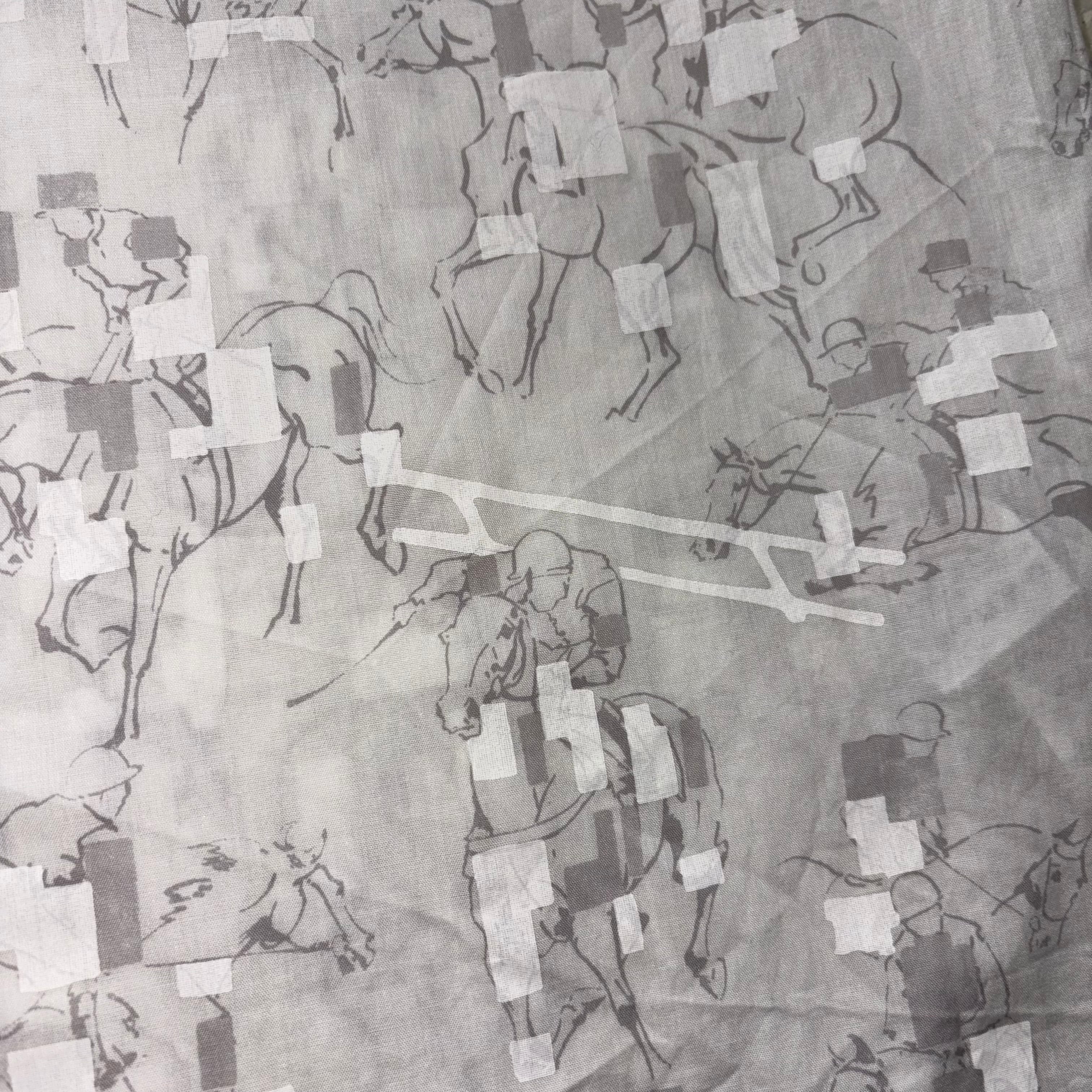 乗馬柄に幾何学柄を重ねたアートな雰囲気の白シャツ。