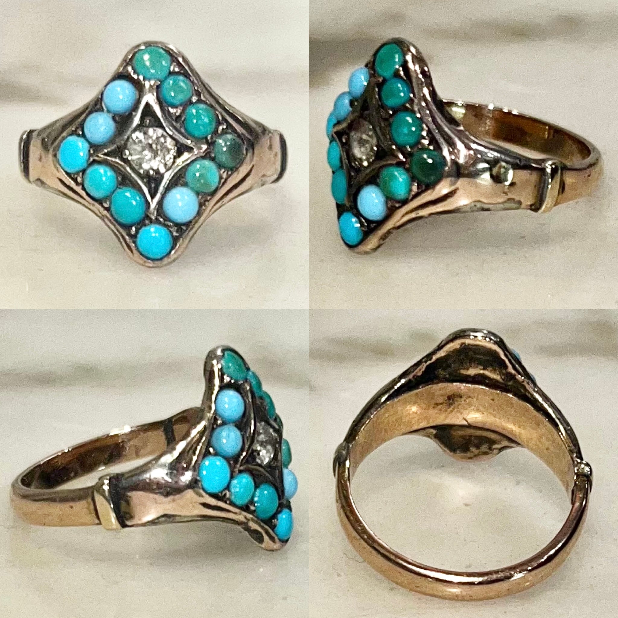 antique 9ct gold diamond & 12turquoise ring