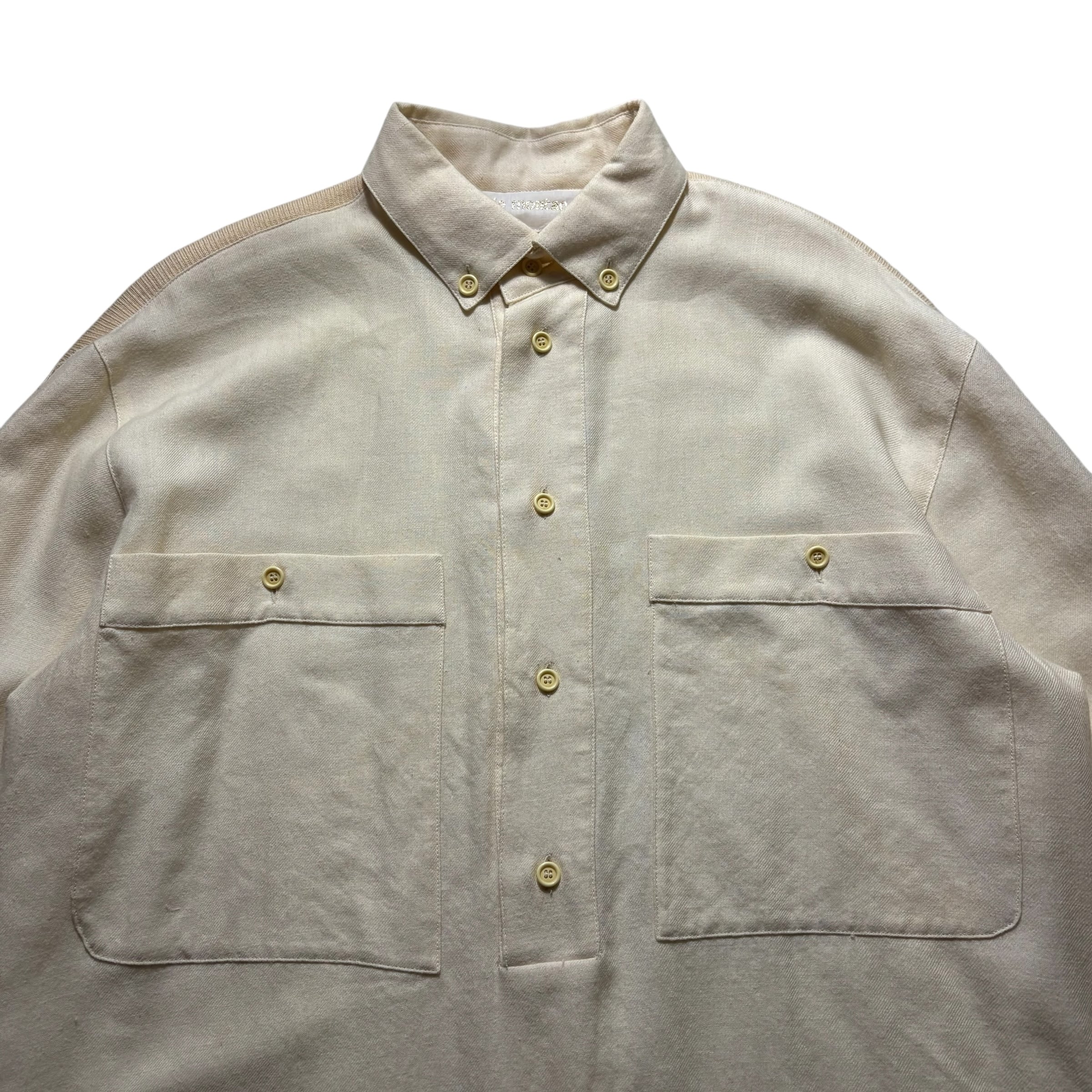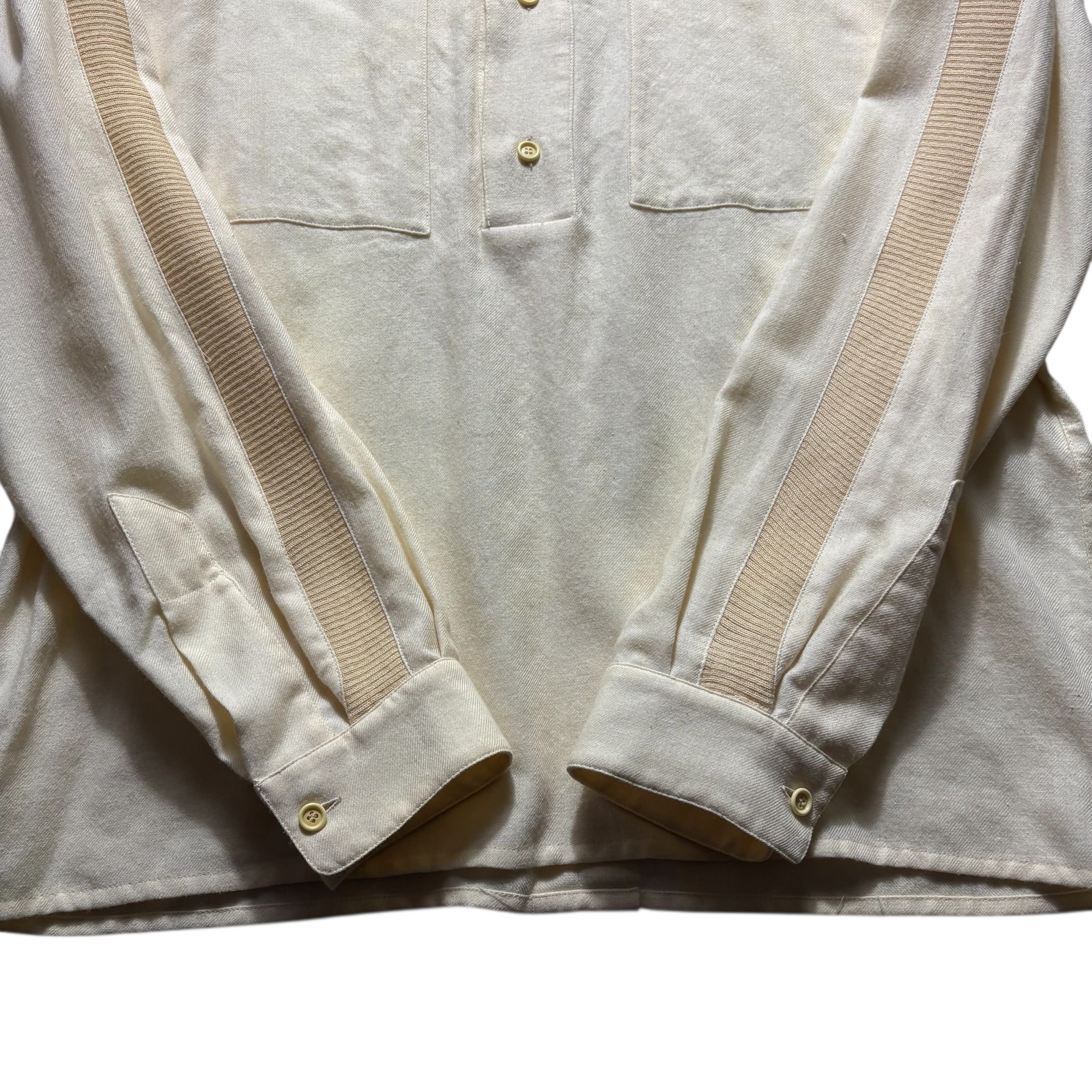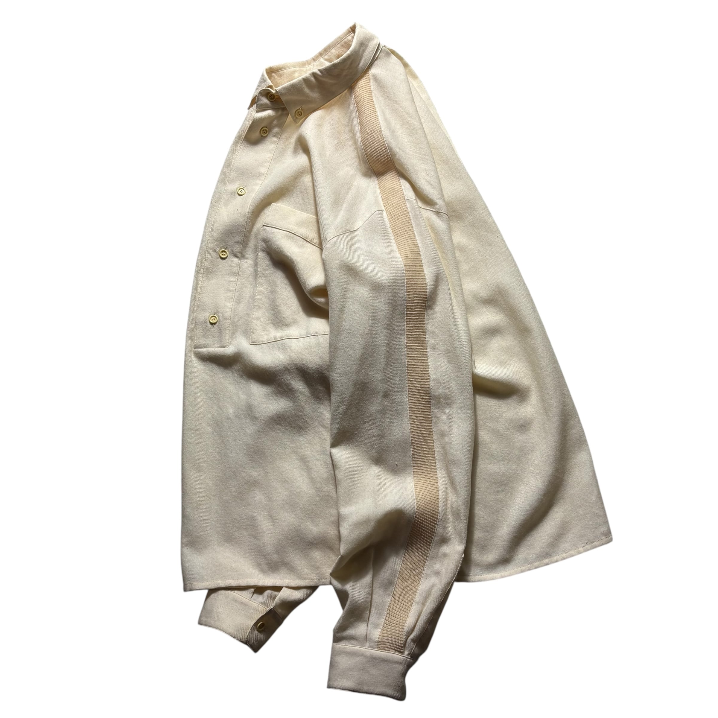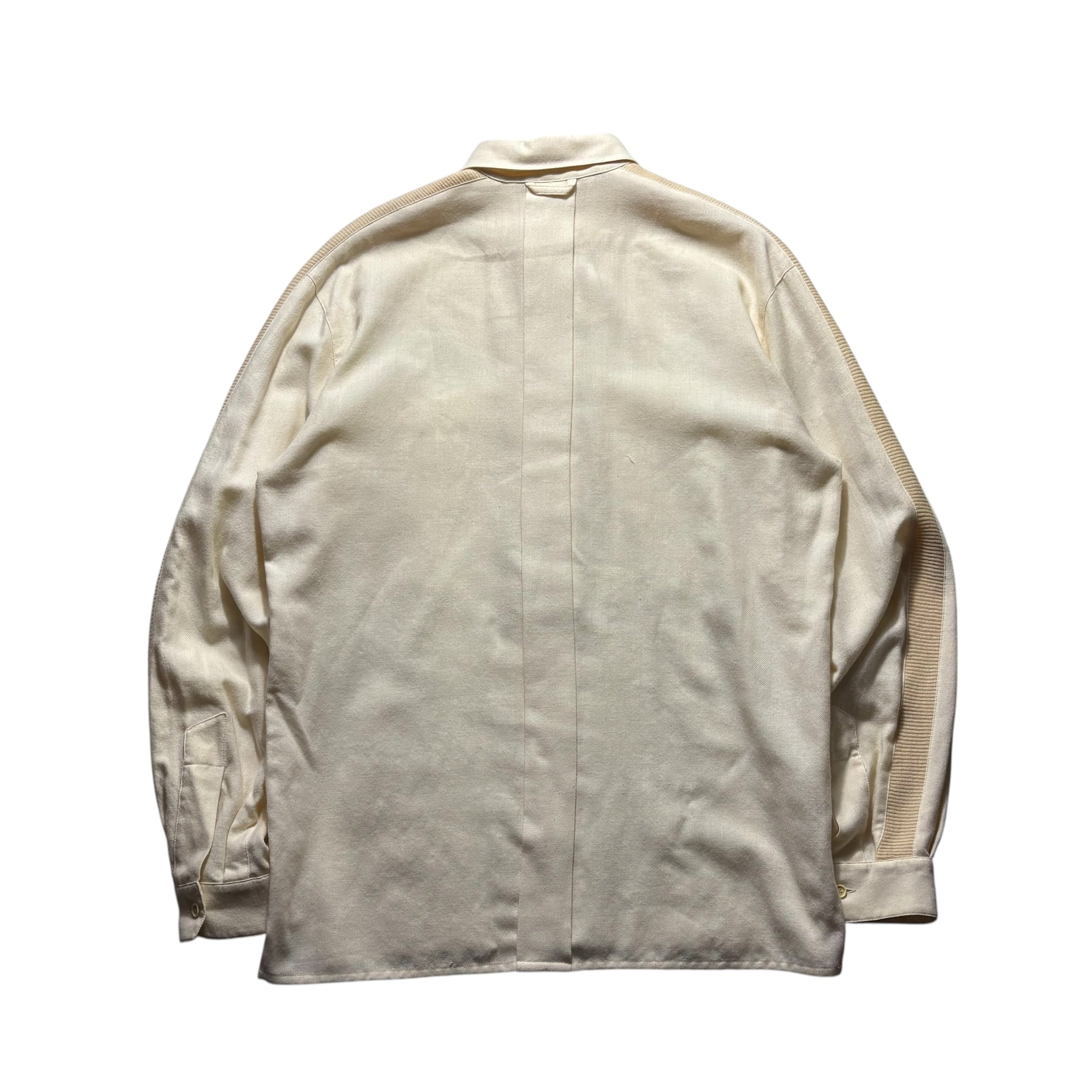 肩から袖口までリブニット切替のウールシャツ。