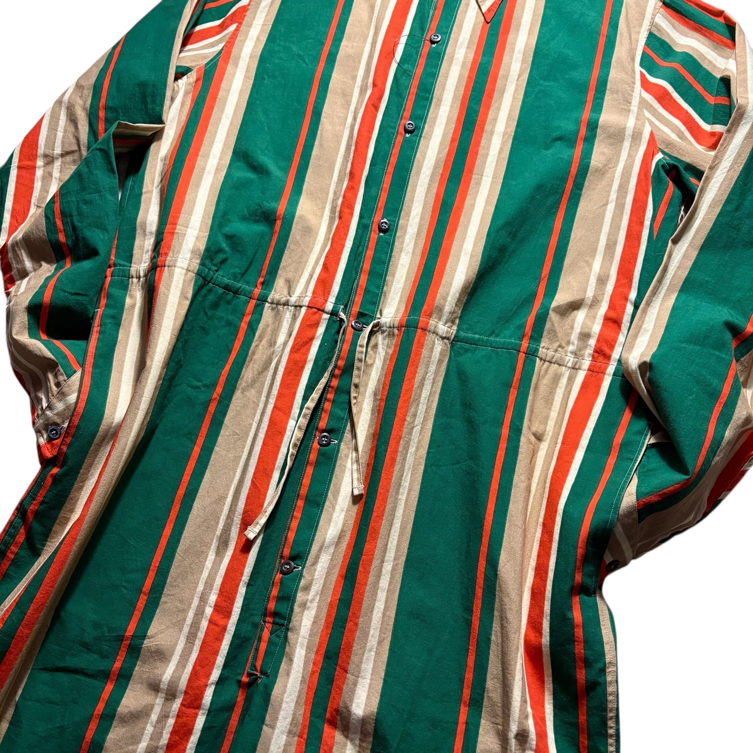size : 表記L 実寸(肩幅45cm 身幅60.5cm 袖丈65.5cm 肩頂点から裾先まだ105.5cm 裾幅30cm)