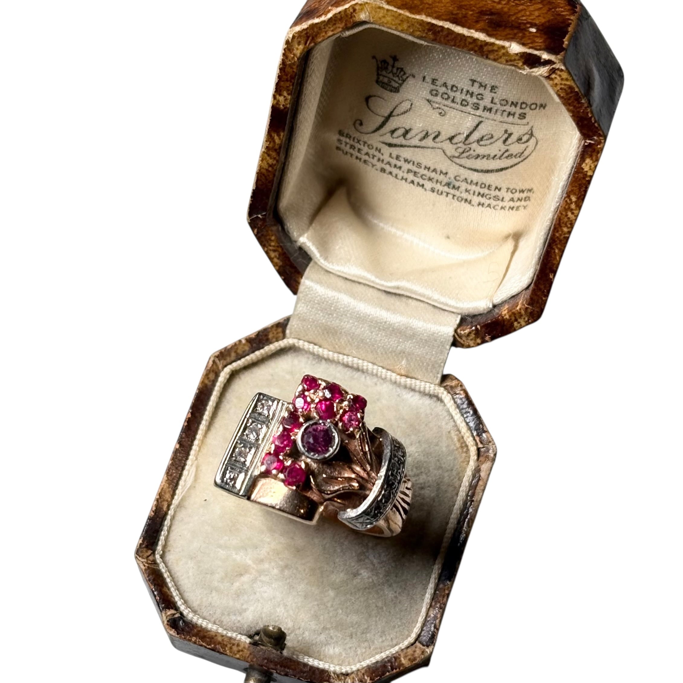 vintage c1940 12ct gold cocktail ring set with ruby & diamonds