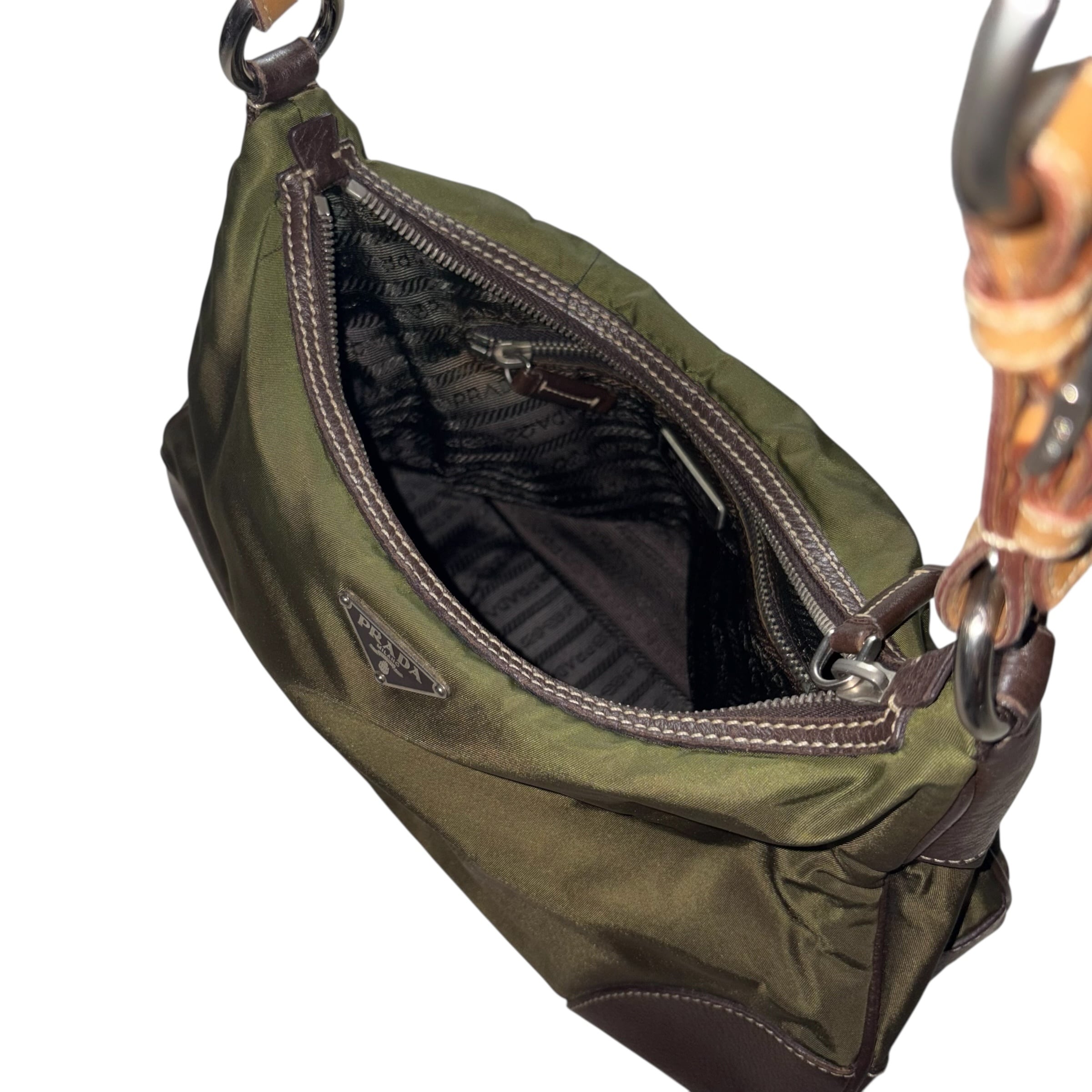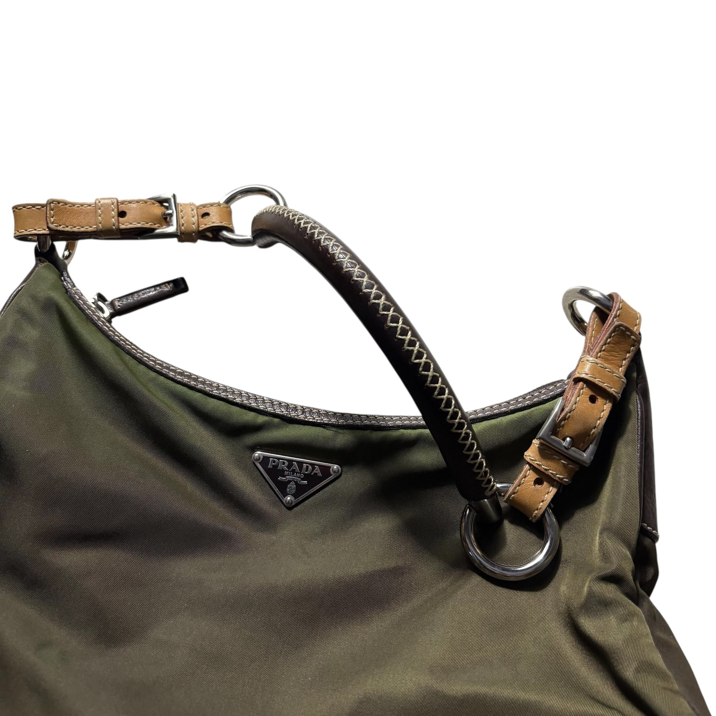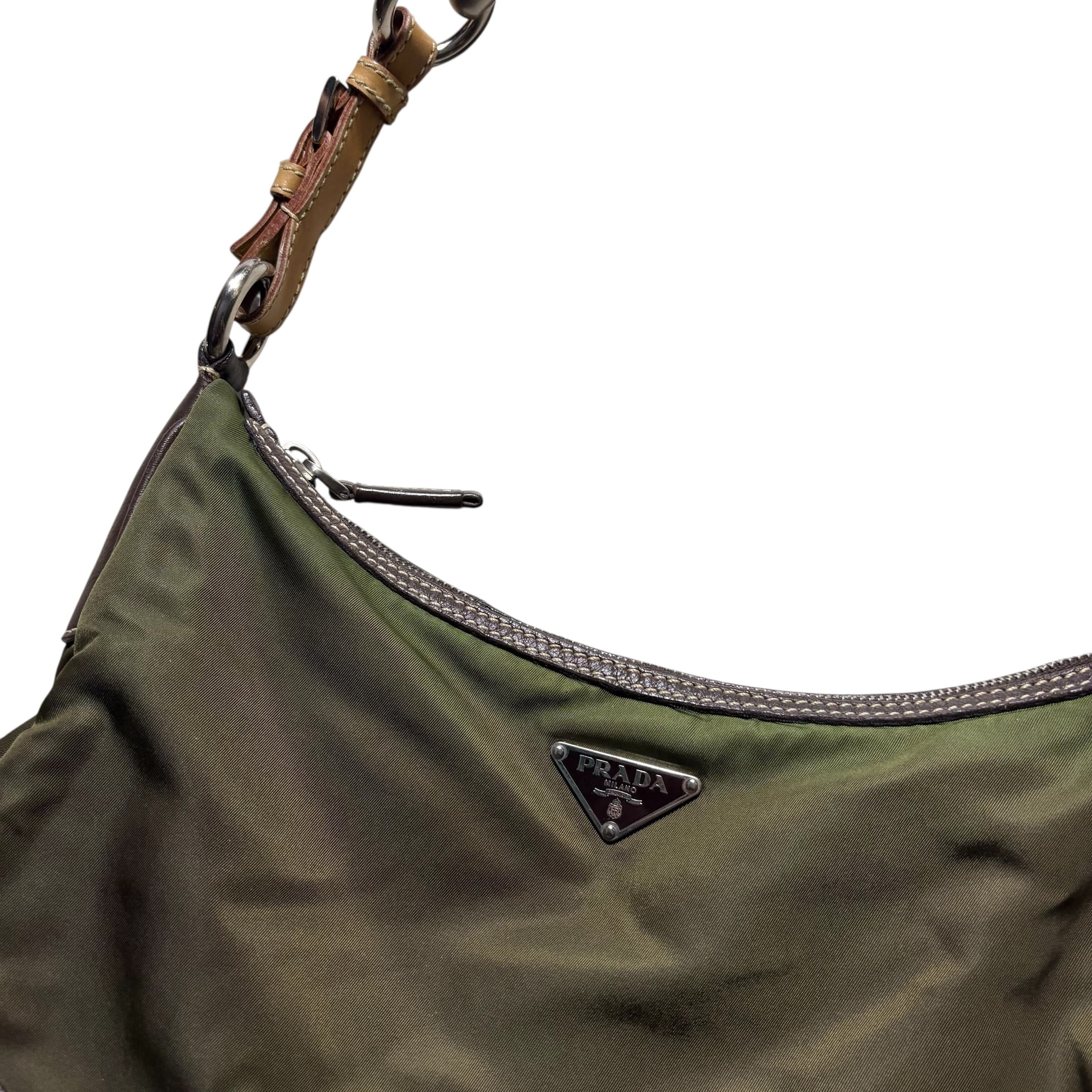 PRADA khaki nylon one shoulder bag with leather strap