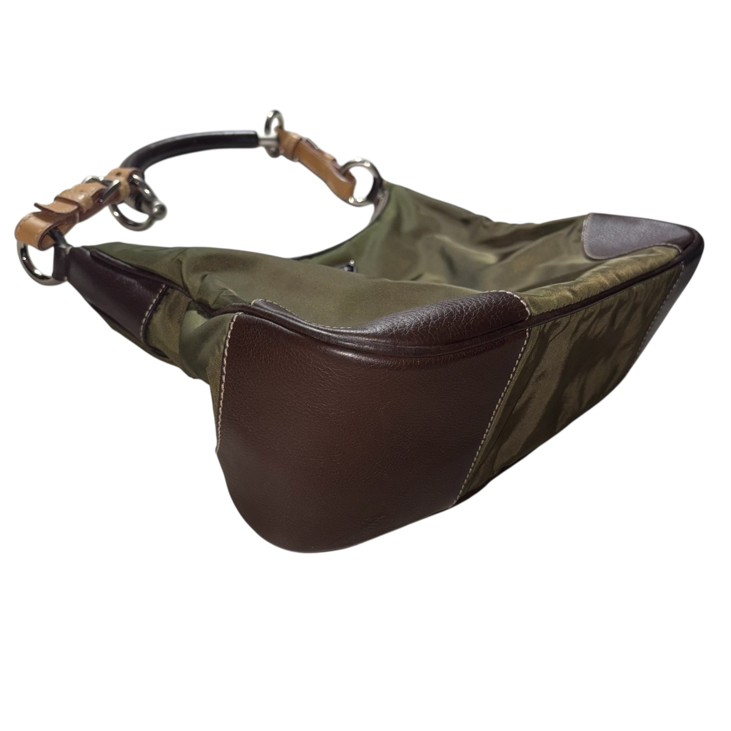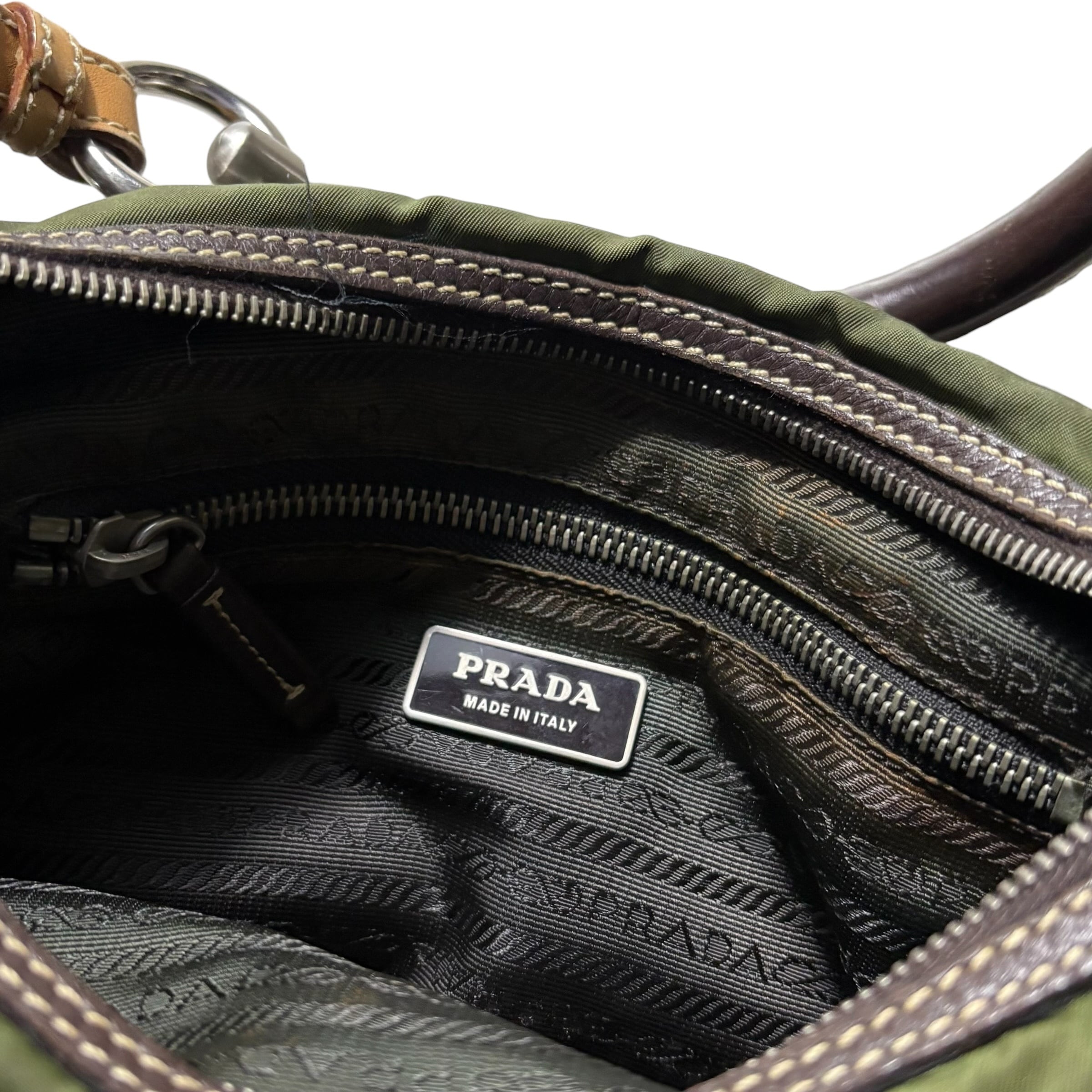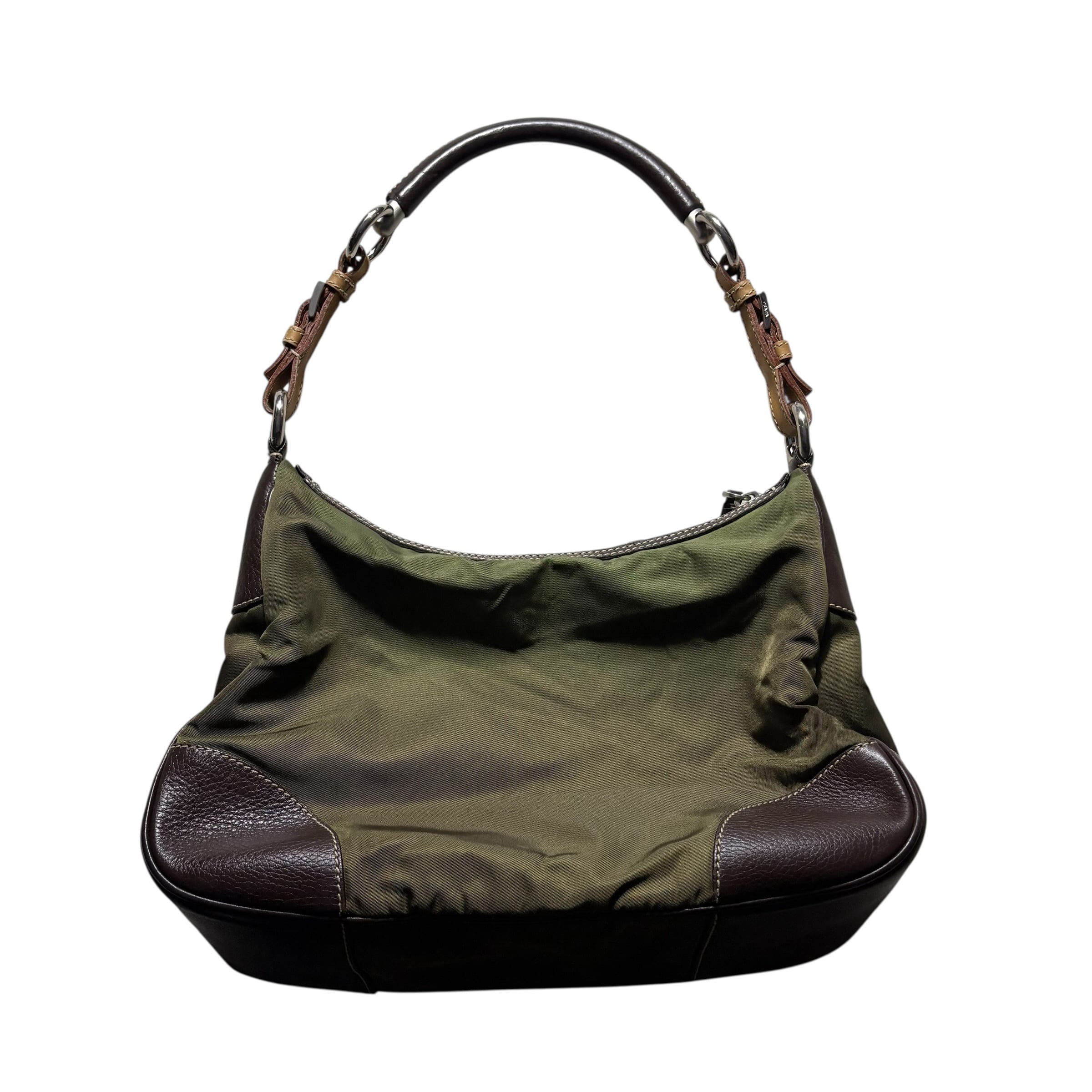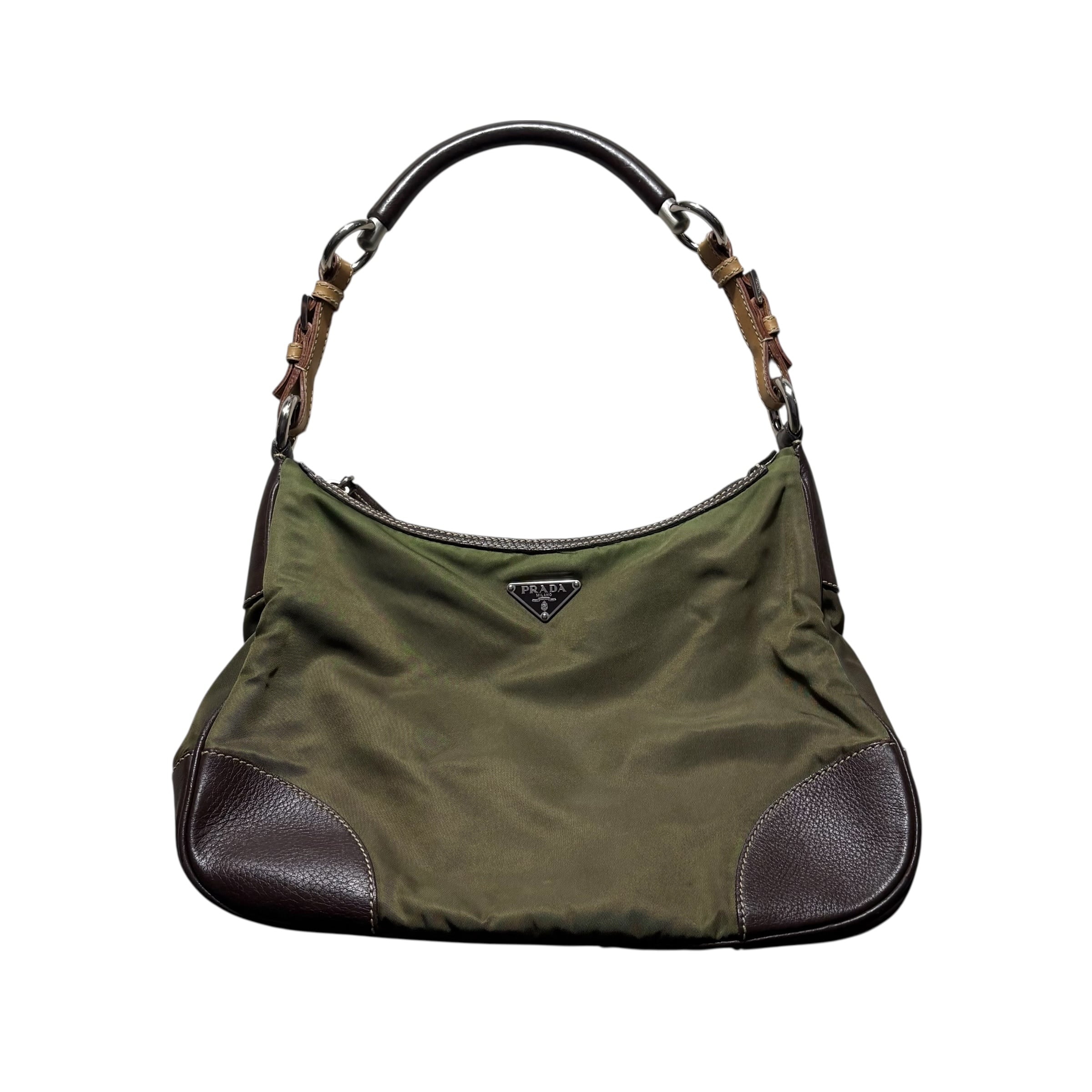 PRADA khaki nylon one shoulder bag with leather strap