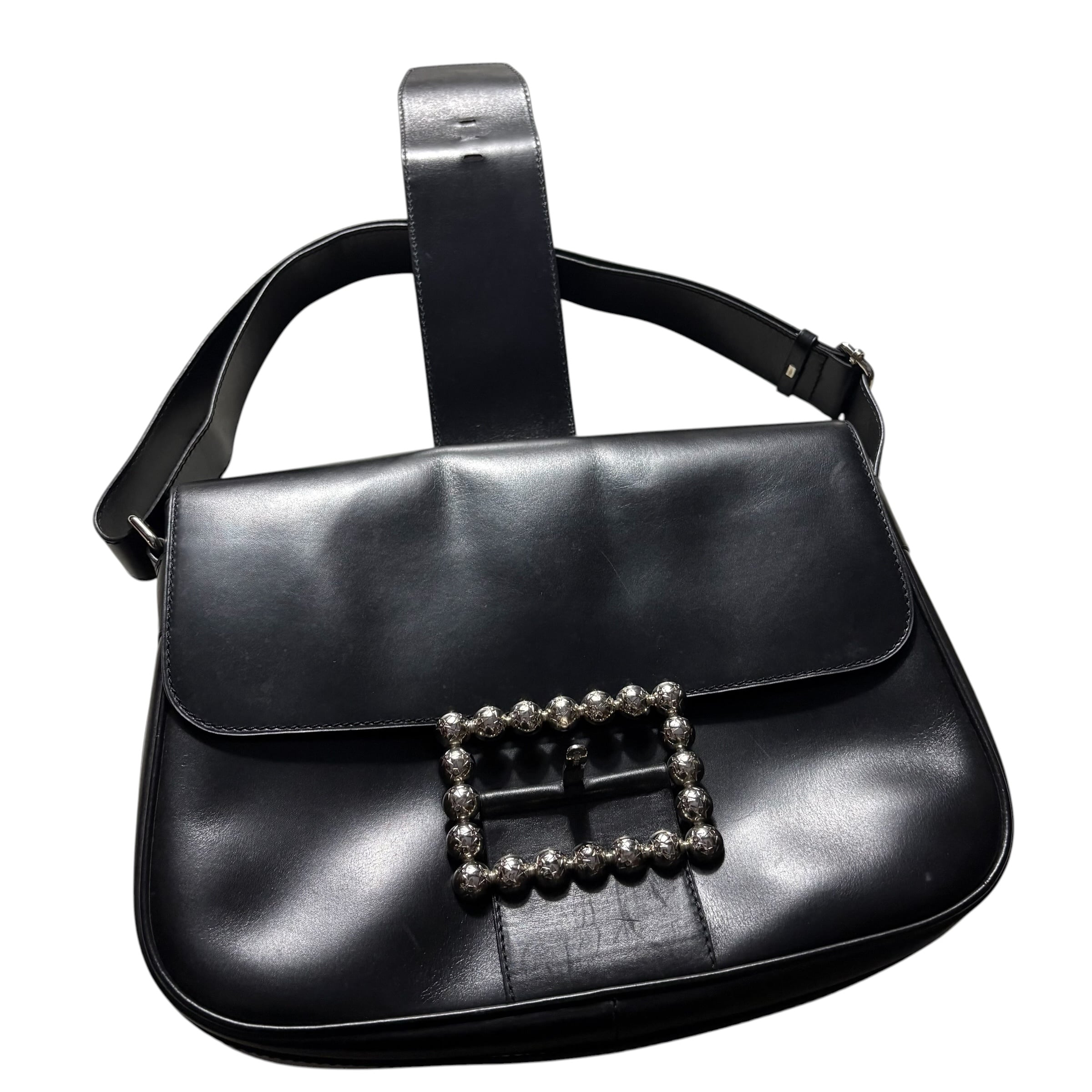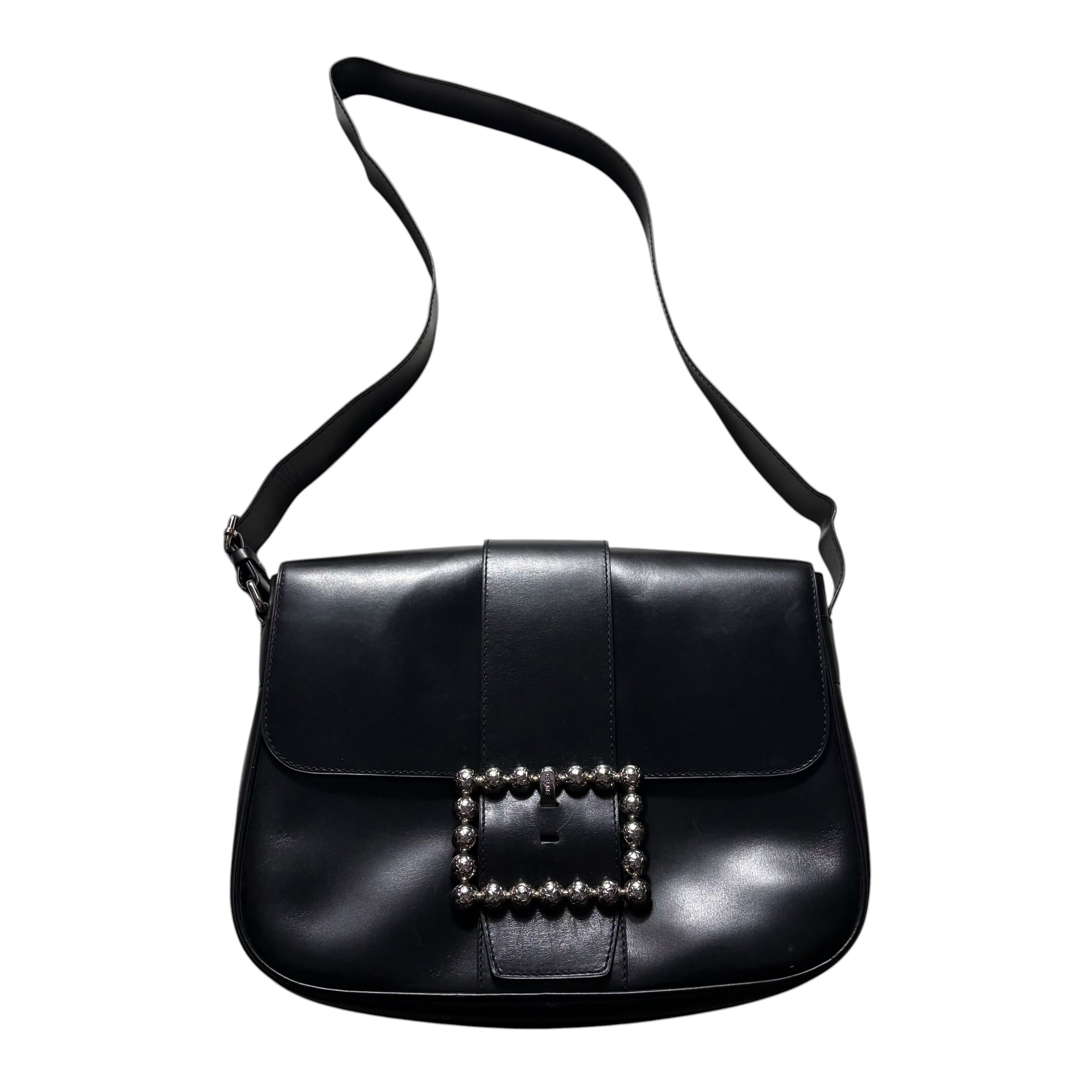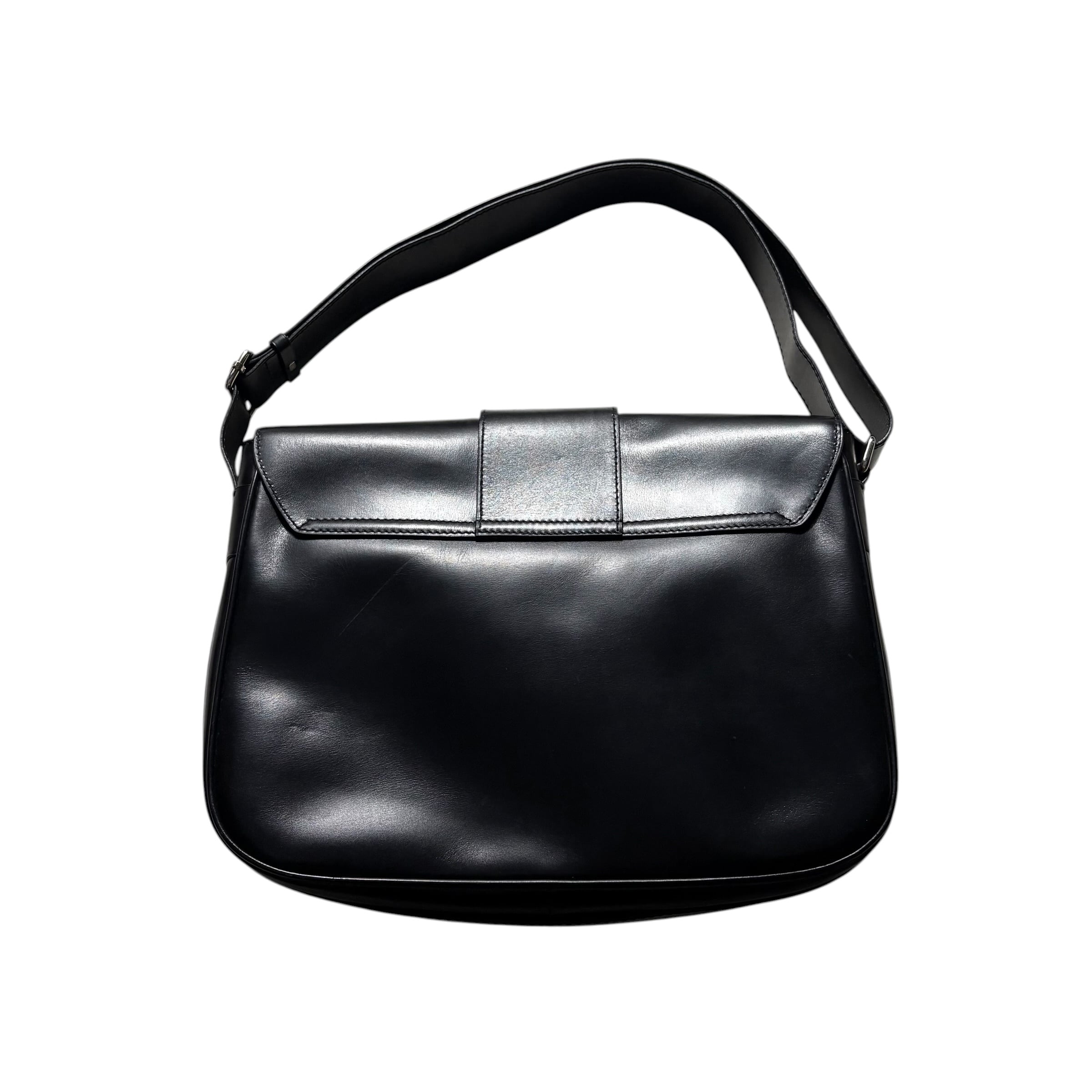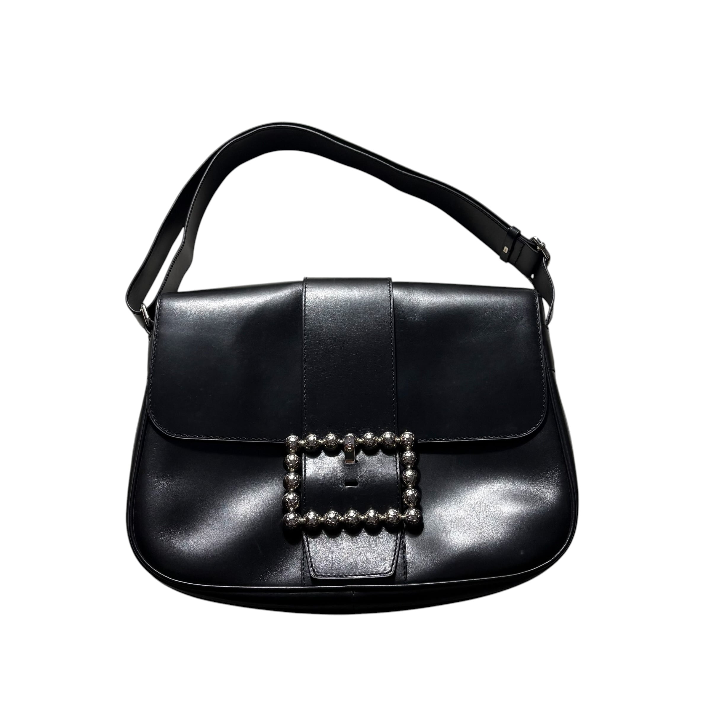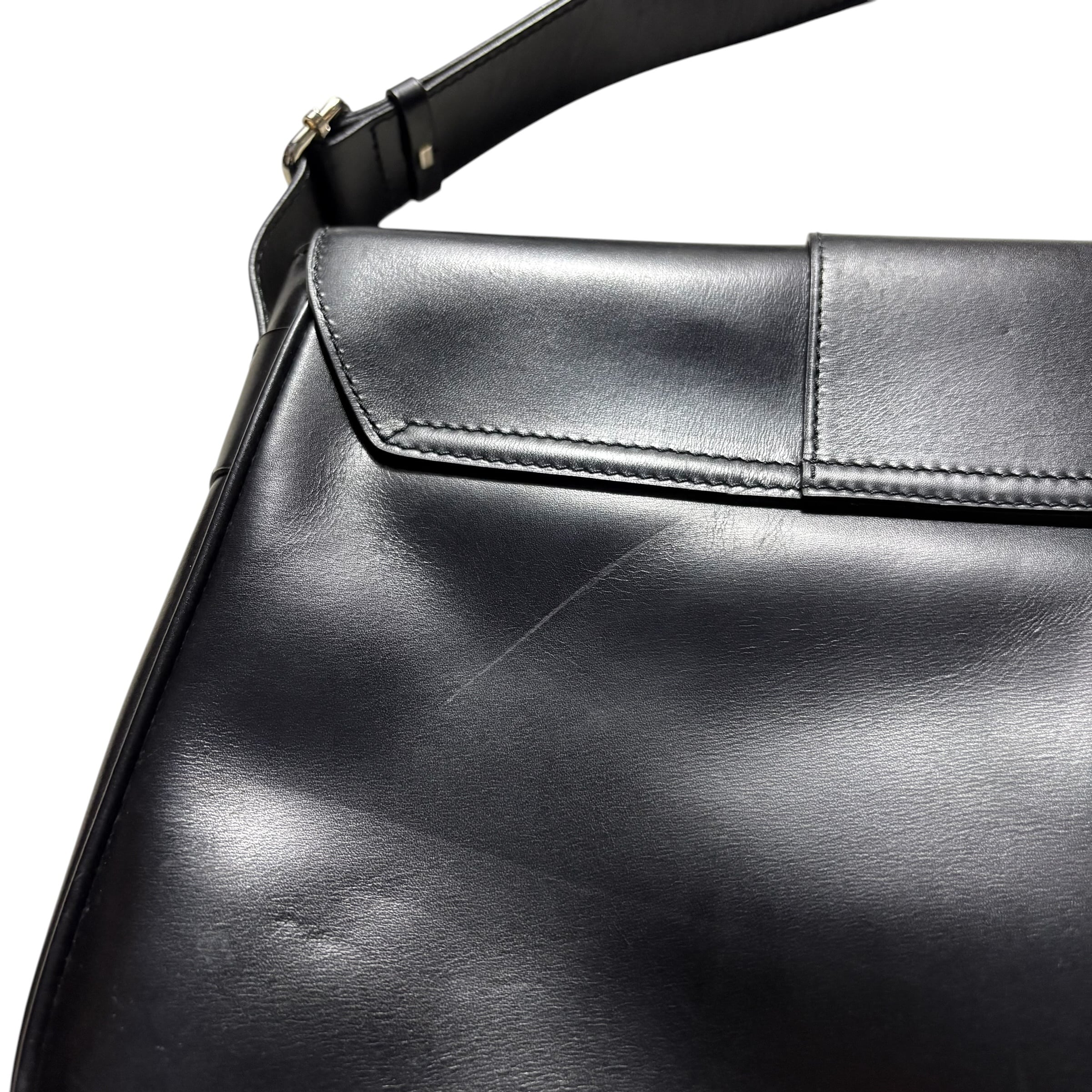 短めワンショルダーから斜めがけまで対応したブラックレザーバッグ。
