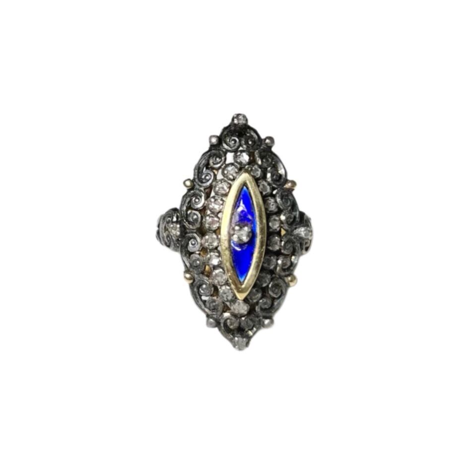 antique 18ct gold blue enamel ring set with diamond