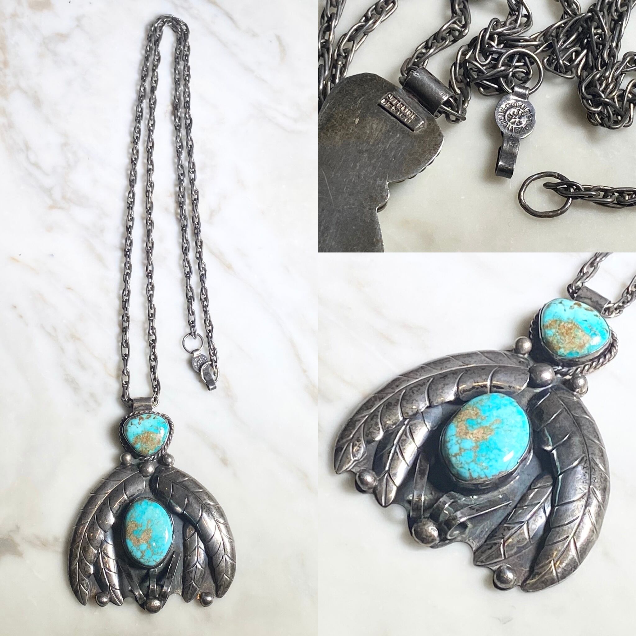 vintage Mexican silver large pendant necklace set with turquoise
