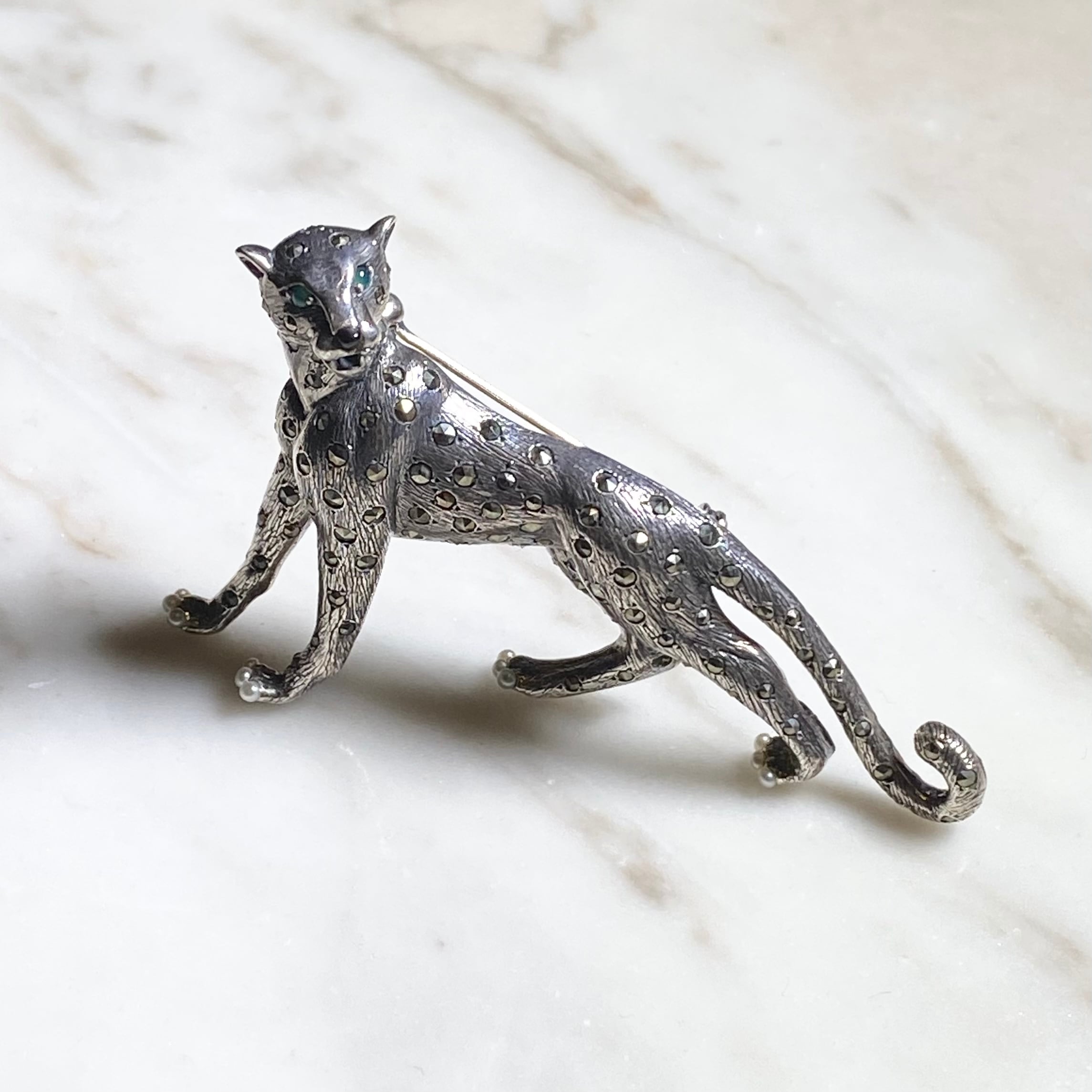 ROKUZAN silver brooch “leopard” set with emerald & onyx & marcasite