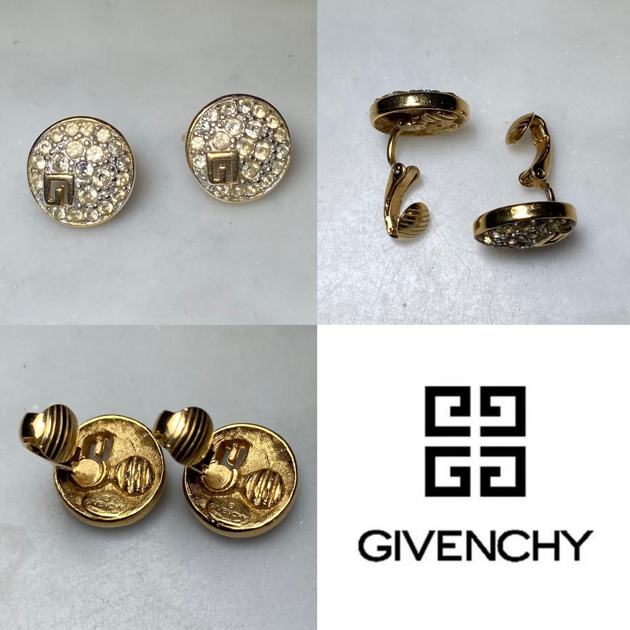 vintage GIVENCHY metal gold color " g " logo earring set with rhinestone