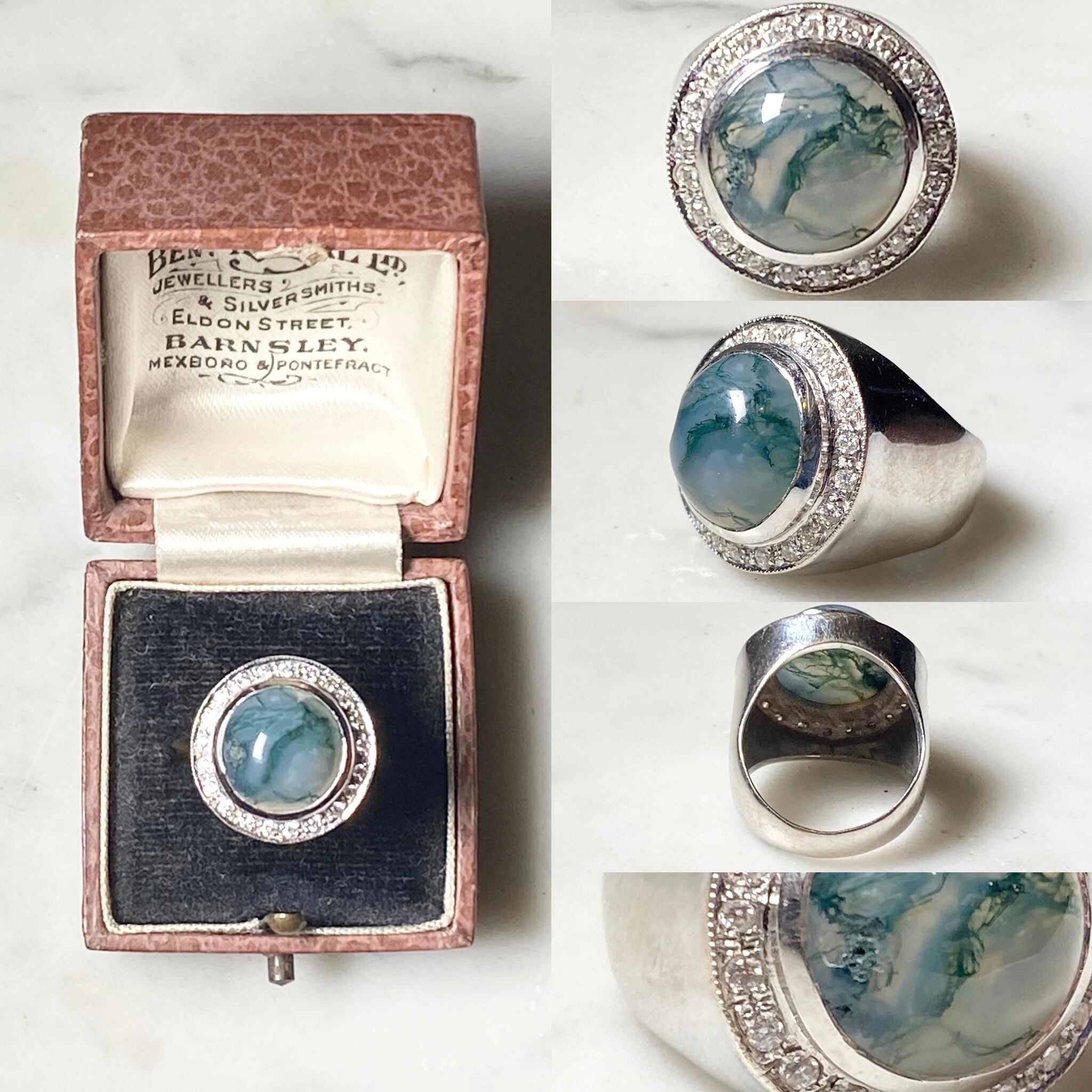 vintage 9ct white gold Moss Agate ring surrounded by Diamonds