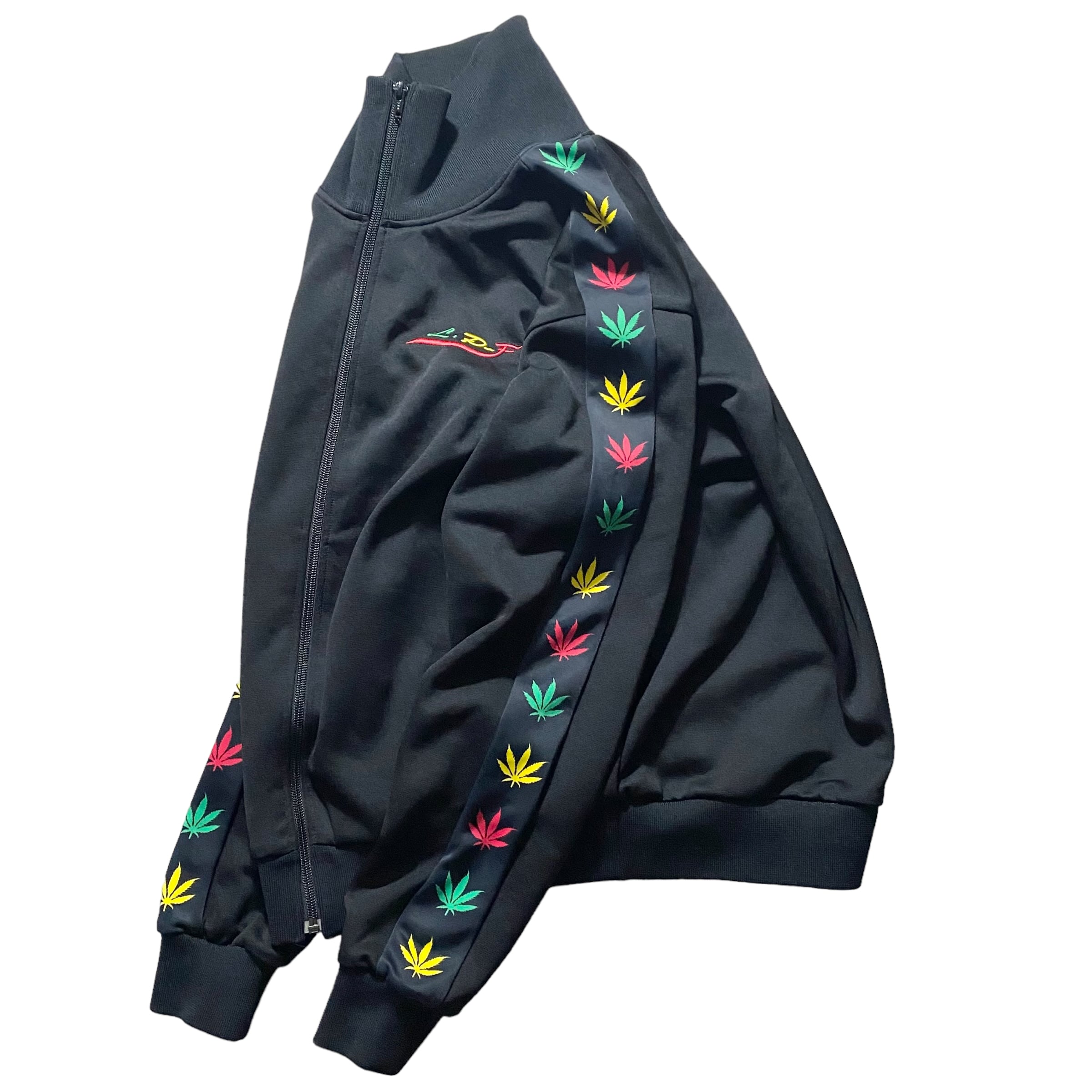 ブラックベースにマルチカラーのロゴ刺繍や袖ガンジャ。