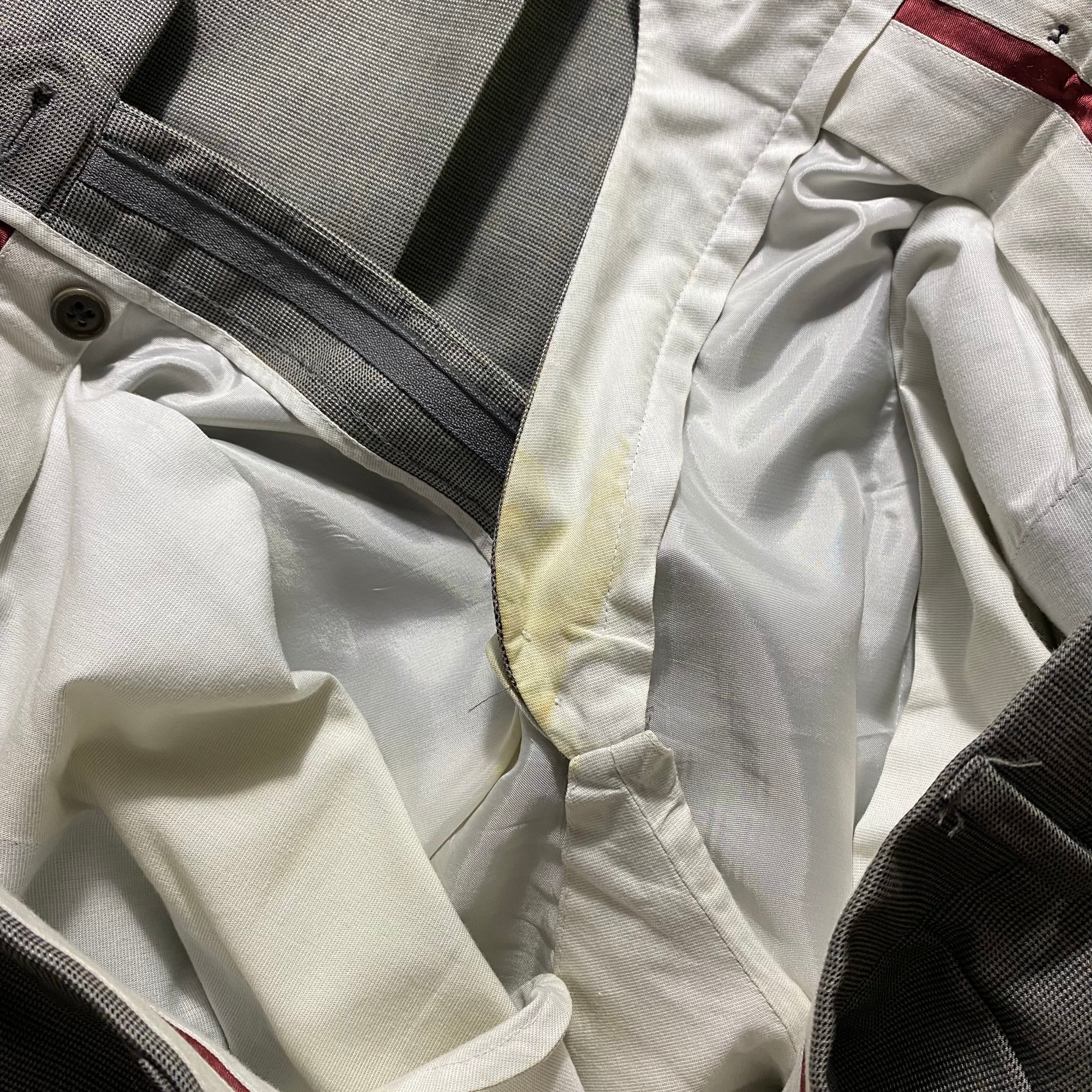 condition:BC(ラペルや腹部ほとんど目立たない染み、袖内側薄汚れ、右脇裏地付け根ステッチほつれ、股内側黄ばみ)