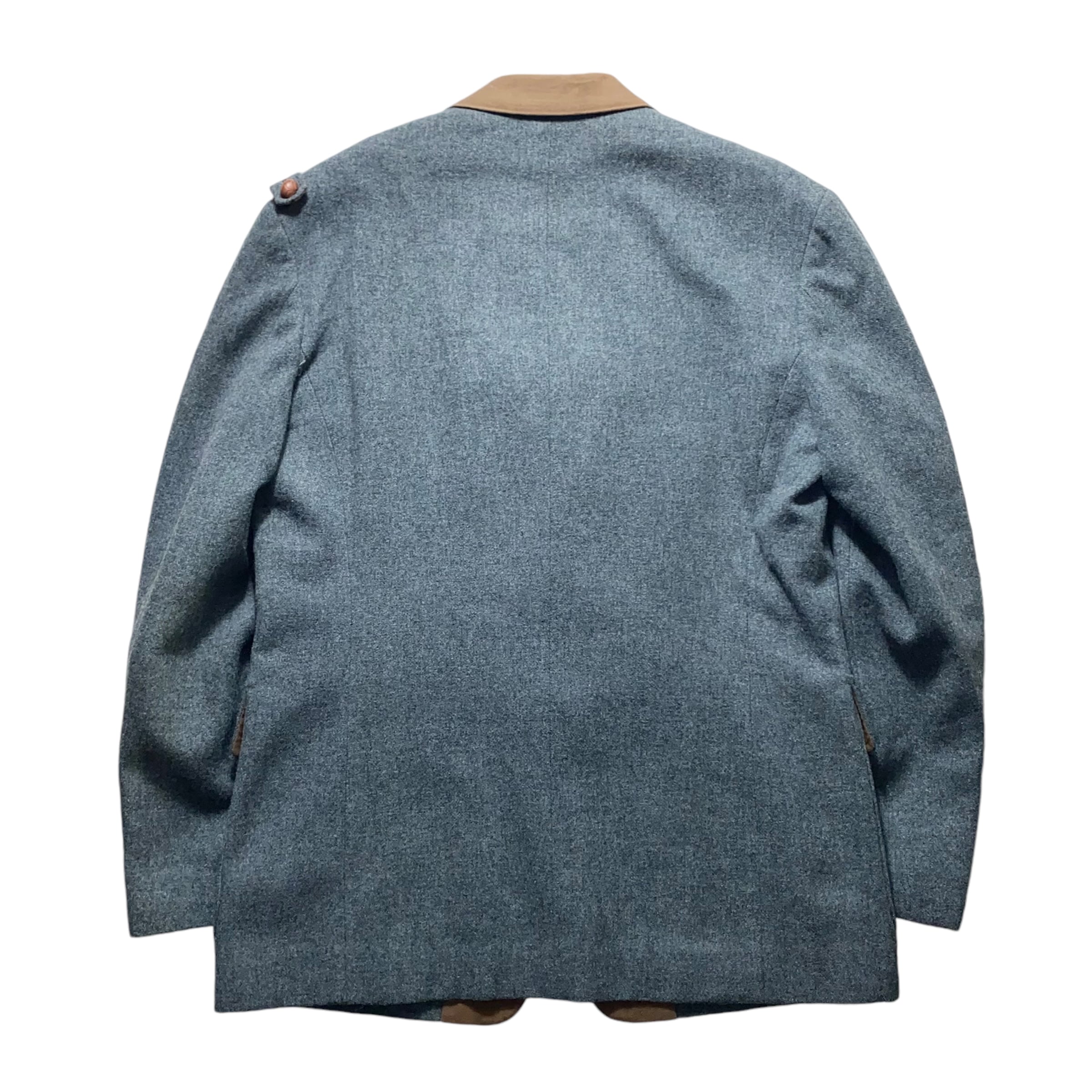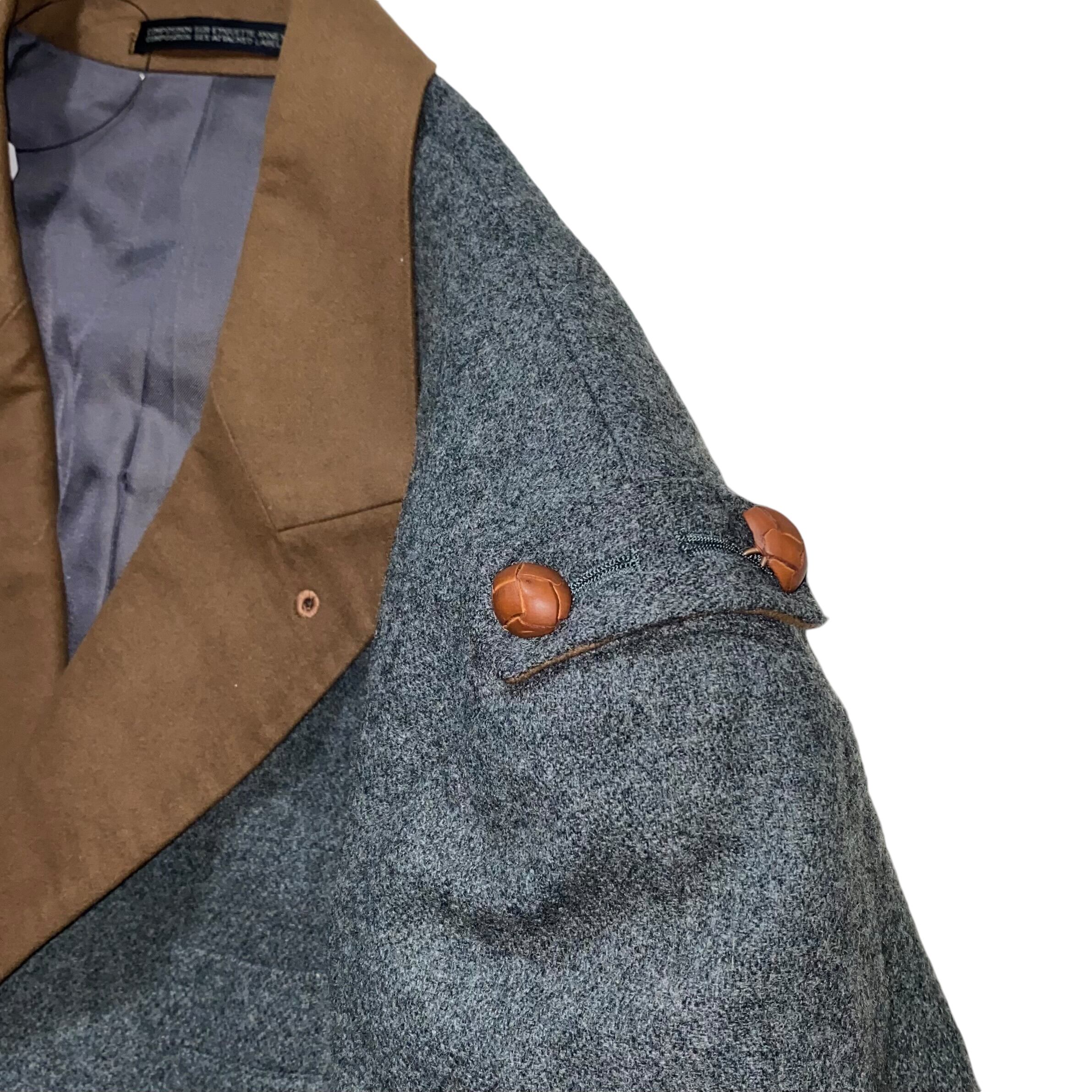 雰囲気のある灰緑のウール地のジャケットのラペルを起毛させた茶系コットンで切替。