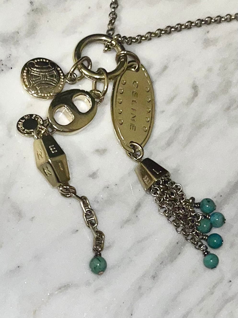vintage CELINE gold color metal various charm fringe pendant necklace with toggle