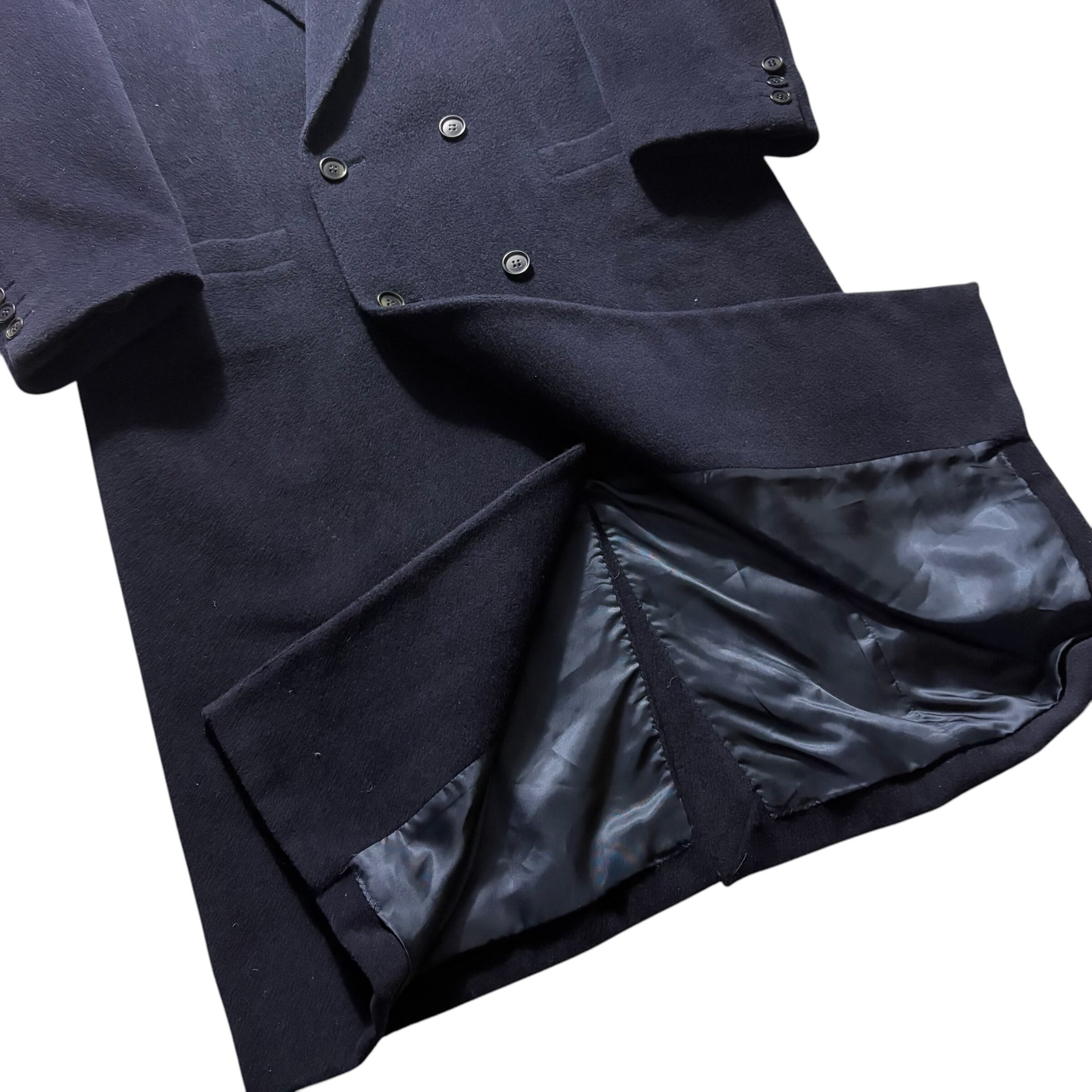 ダブルのネイビーロングコート。